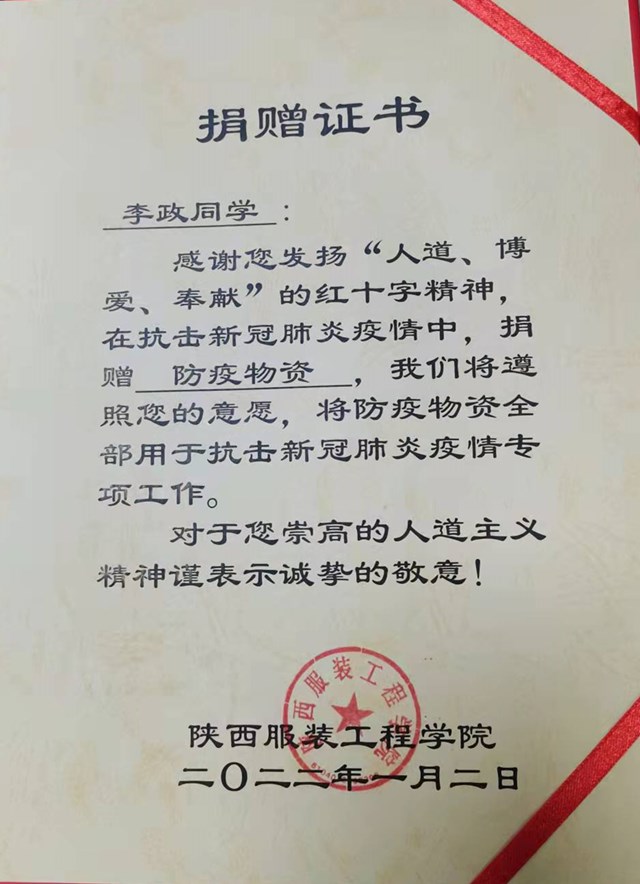 陕服新闻网讯(李文斌)1月2日,我校健康学院大三学生李政同学慷慨为学校捐赠防疫物资一批,本批物资包括口罩、N95口罩、84消毒液、酒精、消毒凝胶等,价值人民币5000余元。