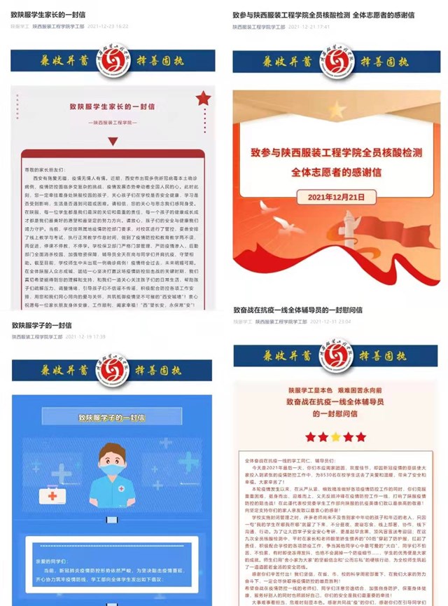 本轮疫情突发以来,陕西服装工程学院认真学习贯彻习近平总书记关于疫情防控工作的重要讲话和指示批示精神,按照省委教育工委、省教育厅部署,切实抓好学生疫情防控、思想政治教育、关心关爱帮扶等工作,努力为学生健康成长护航。