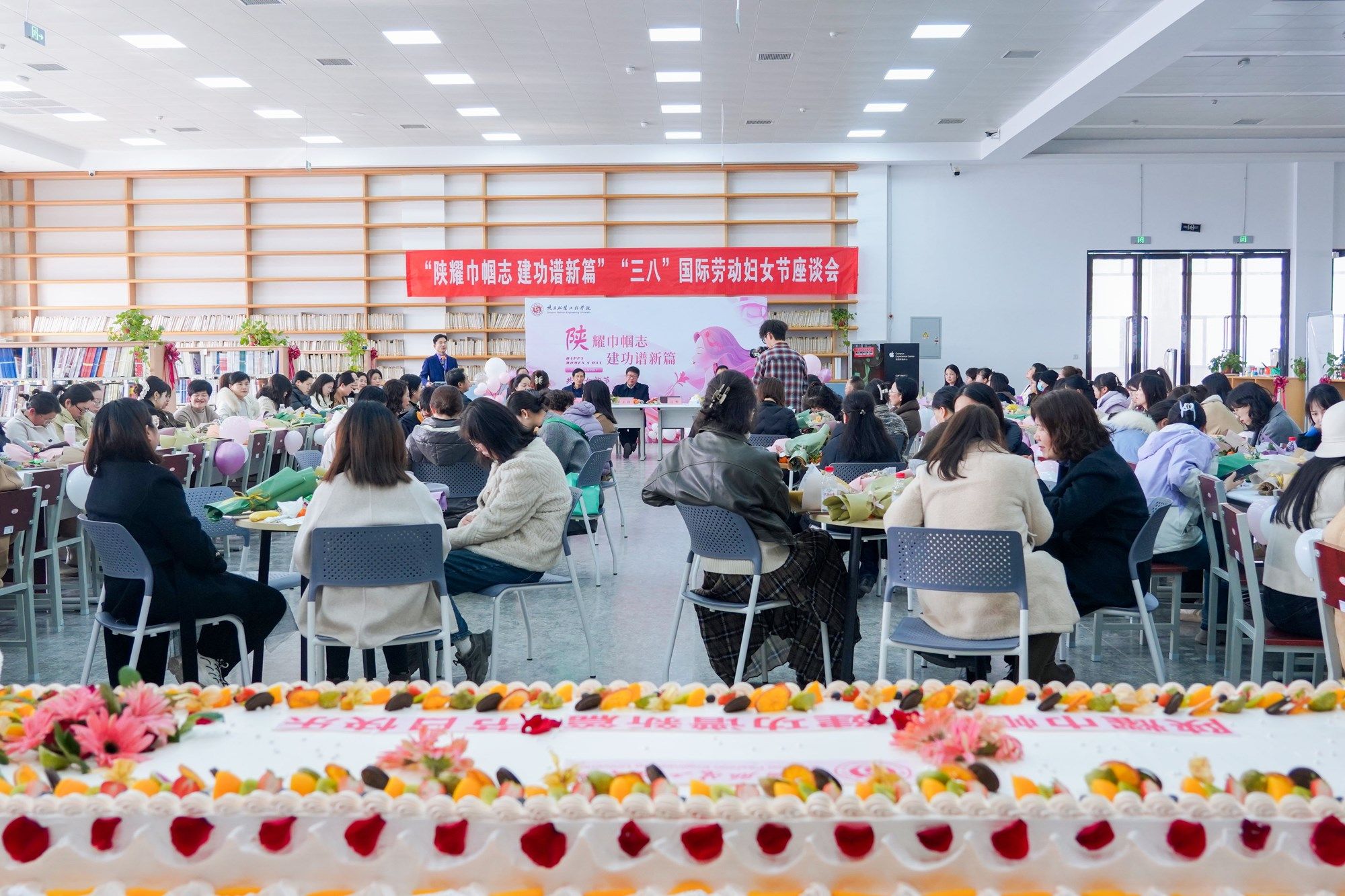 3月7日下午,校工会在图书馆举办了“陕”耀巾帼志,建功谱新篇——共庆女神节,凝心聚力促评估座谈会。校领导为女职工送上鲜花,致以节日的诚挚问候和衷心祝福,感谢广大女职工在各自岗位上的辛勤付出与无私奉献,勉励大家继续努力工作,奋力展现巾帼担当。现场气氛热烈,全校女教师代表齐聚一堂,共同聆听楷模故事,激发奋进力量。董事长吕明博士、副董事长吕超、副校长潘庆才、副校长刘运、工会主席刘明夫出席活动,全体校工会委员、分工会主席、女教职工代表参加活动。党委书记王岗主持会议并作总结讲话。