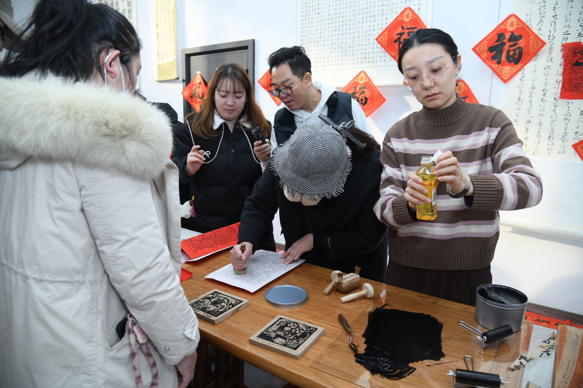 活动现场暖意融融、墨香四溢,红彤彤的春联纸与金灿灿的福字笺整齐摆放。活动中,书法功底深厚的张哲、杭上尚等老师现场挥毫,提落之间尽显笔墨神韵;一点一画,皆蕴对传统文化之挚爱。成嘉琪等热爱非遗文化的老师将自己制作的木版年画门神、吉祥马等作品赠予大家。现场欢声笑语不断,每个人的脸上都洋溢着幸福的笑容。